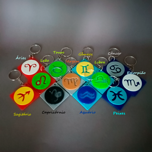 Chaveiro multicolorido com os símbolos do zodíaco; disponível nas cores abaixo (o resultado final pode variar, dependendo da densidade e/ou textura da peça):