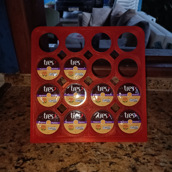 Porta-cápsulas padrão Três Corações, com capacidade para 16 unidades; disponível nas cores abaixo (o resultado final pode variar, dependendo da densidade e/ou textura da peça):